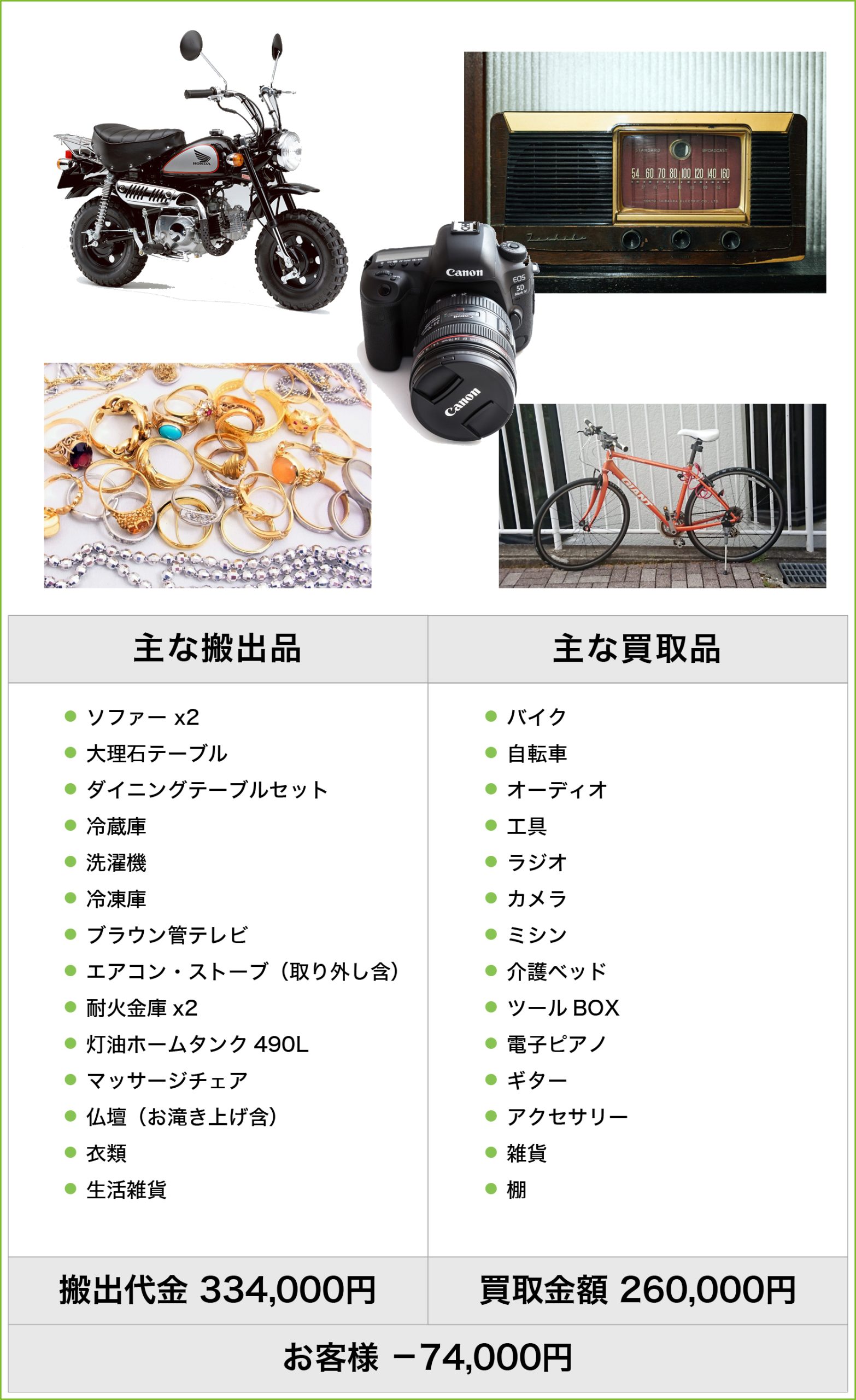 遺品整理を行うというと、膨大な費用をご想像される方もいらっしゃると思いますが、基本的には不用品の処分にかかる費用、当社にお支払いいただく仕分け作業費、それくらいの基本的な金額しかかかりません。